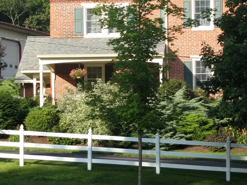 ● 住宅地景観フェンス: 白い PVC ポストと水平レールおよび緑の組み合わせが、古典的な英国または米国の地所スタイルの境界を作成します。