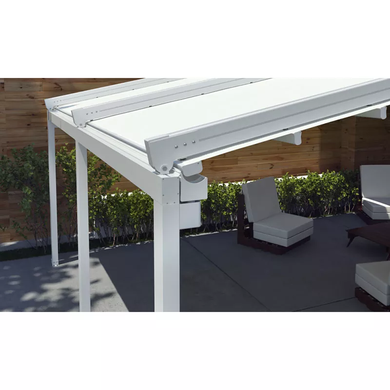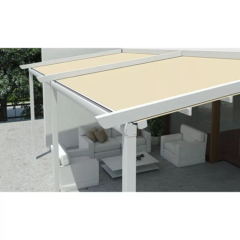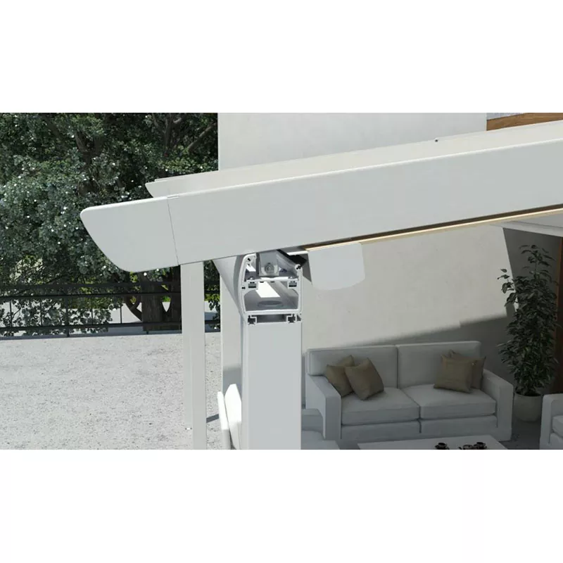 高性能と耐久性を提供するために Vionta が独自に設計した電動格納式パーゴラ。 120 x 70 mm のガイド プロファイルと PVC カバーにより、最大 6 メートルの投影長を実現し、広いエリアを快適にカバーします。