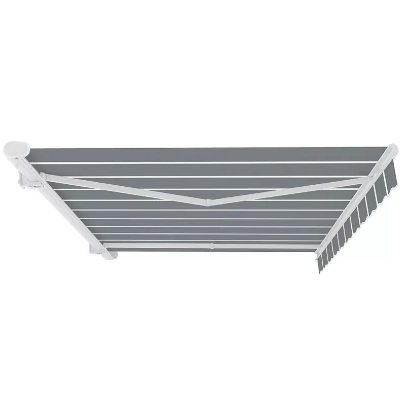 非常に高い仕様に仕上げられており、粉体塗装されたアルミニウムアームを備えた強力な軽量金属フレームを備えています。左側の巻き取りハンドルで簡単スムーズに開閉できます。オーニングは、最大の突出量まで、お好みに合わせて開くことも、小さく開くこともできます。